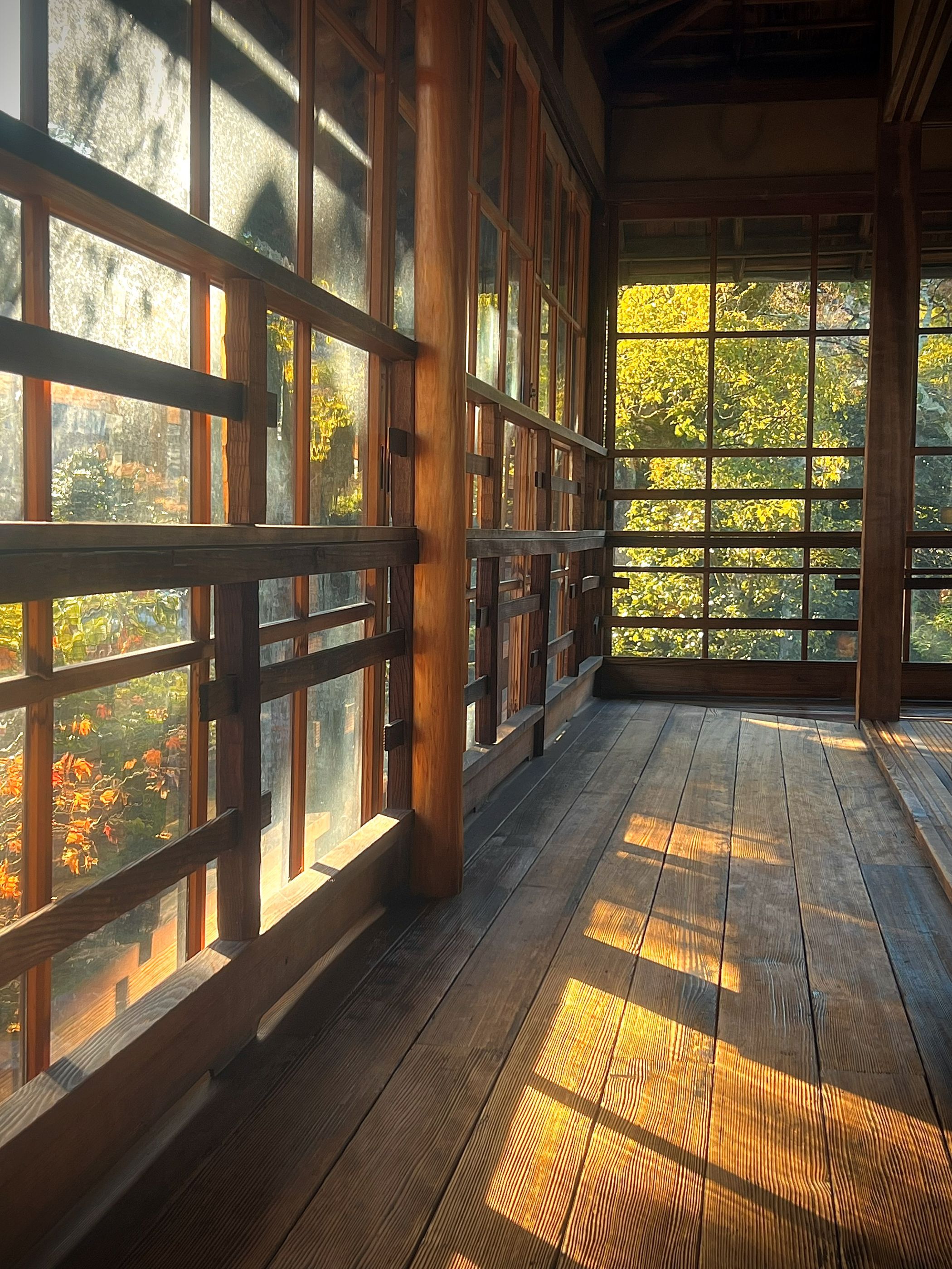 開場前、母屋二階の窓辺に朝日が差し込む穏やかな光景。文化財といえど、もともと人の営みがあった場所です。そして今は、世に開かれた文化財として管理運営されながら、多くのお客様を迎え、呼吸し鼓動し続けています。そんな無鄰菴の日常の営みを感じさせるこの一枚からも、無鄰菴スタッフとしての大島さんが無鄰菴を生きる文化財として見つめていることが感じられるのです。