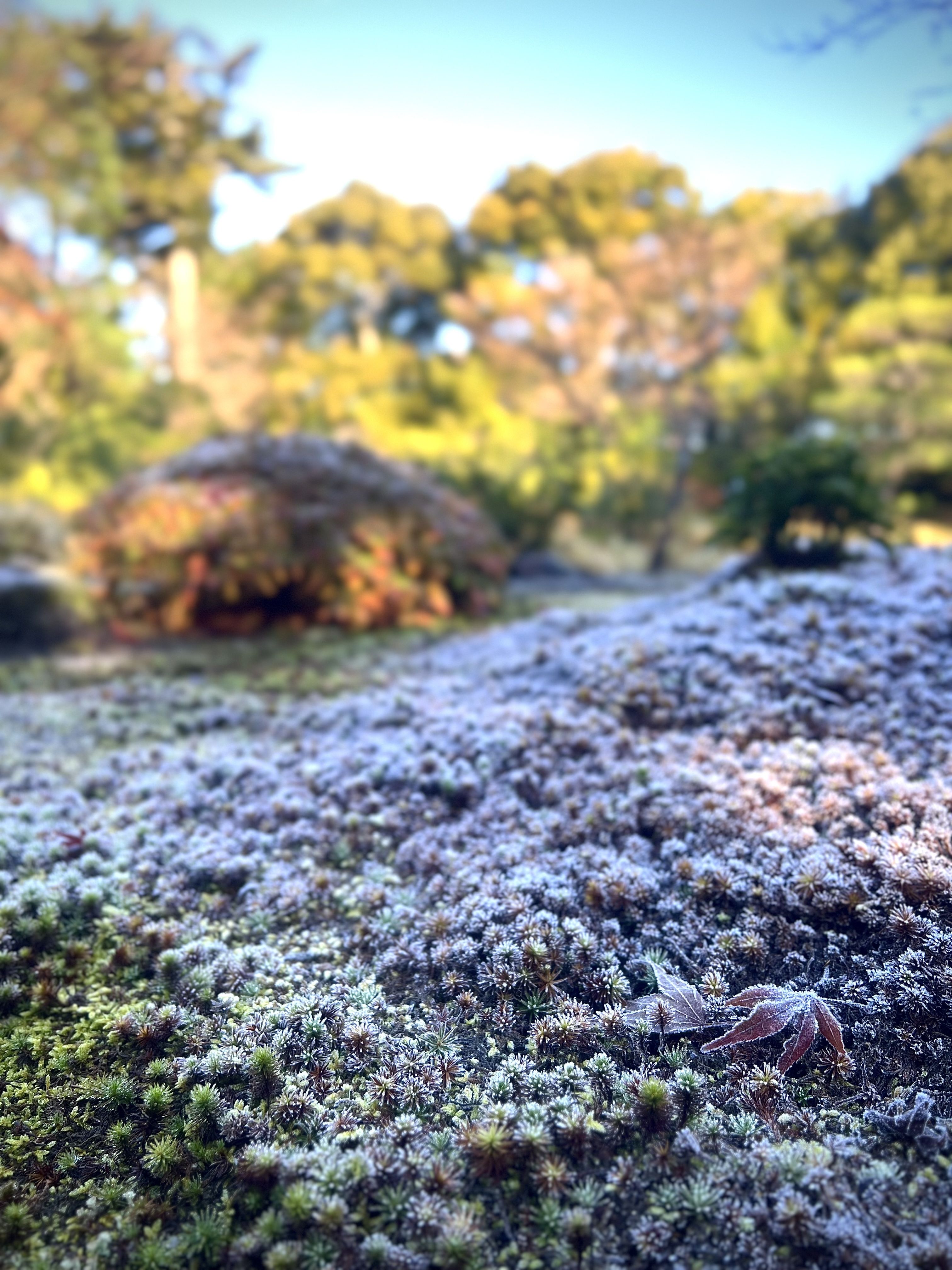 早朝、まだ誰も踏みしめていないお庭の園路で、一人、心が揺さぶられる景色を探す。 冬の凛とした空気。琵琶湖疏水を引き込んだ流れの湿り気が肌をなで、せせらぎの音、鳥の鳴き声が静寂に息吹を与えていた。ふと立ち止まり、足元の苔にレンズを向ける。紅葉の落ち葉がひとひら。苔とともに霜をまとい、やわらかな朝の光にキラキラと輝いていた。
