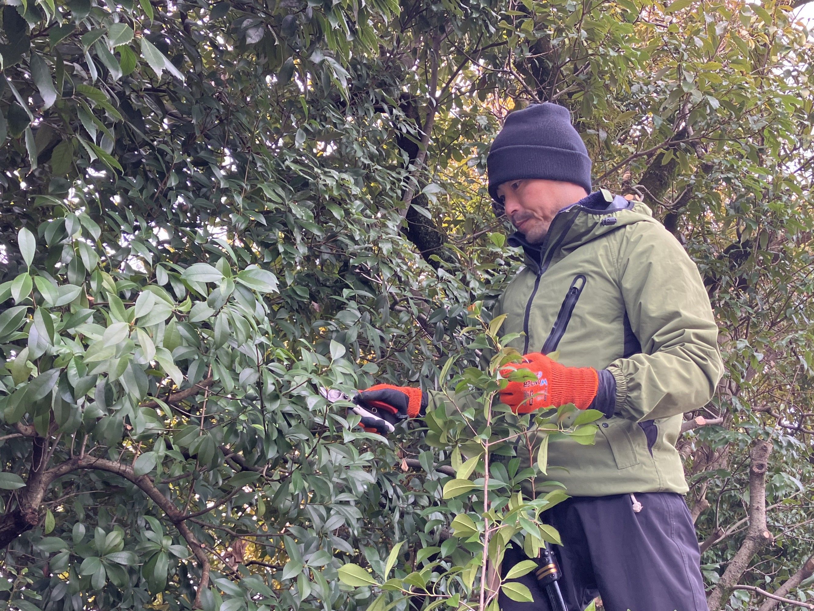 日々の作業のちょっとしたことの工夫のが積み重ねも、効率よくお手入れを進めるために必要な工程です。あとは木に登って枝を切り、下から、庭園の中から仕上がりを確認して調整することの繰り返しです。