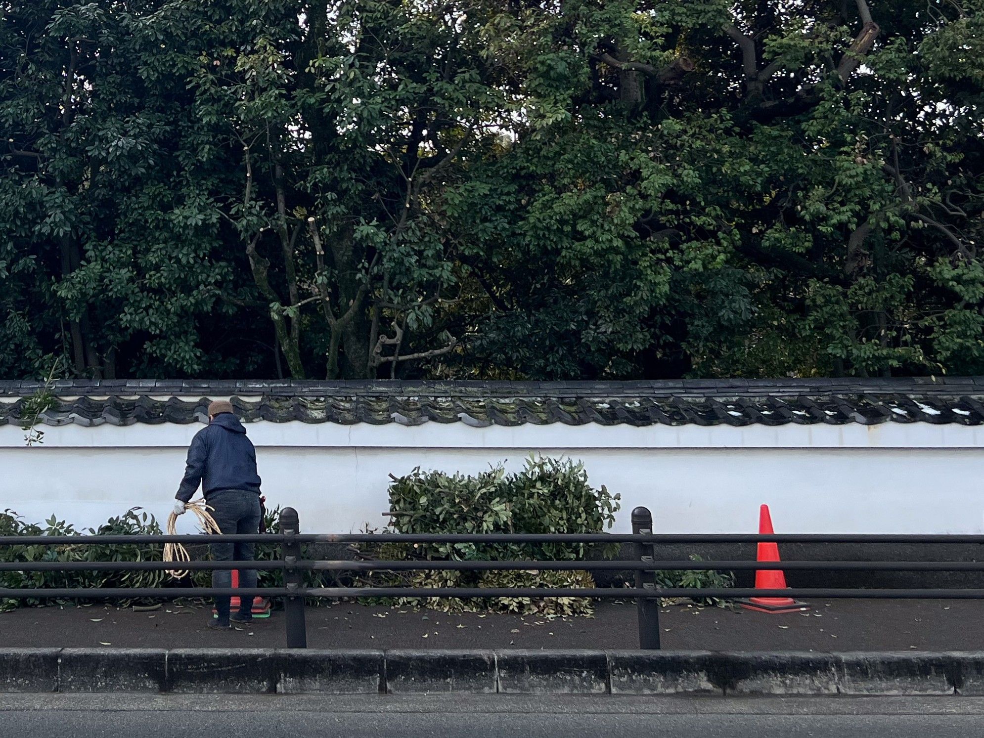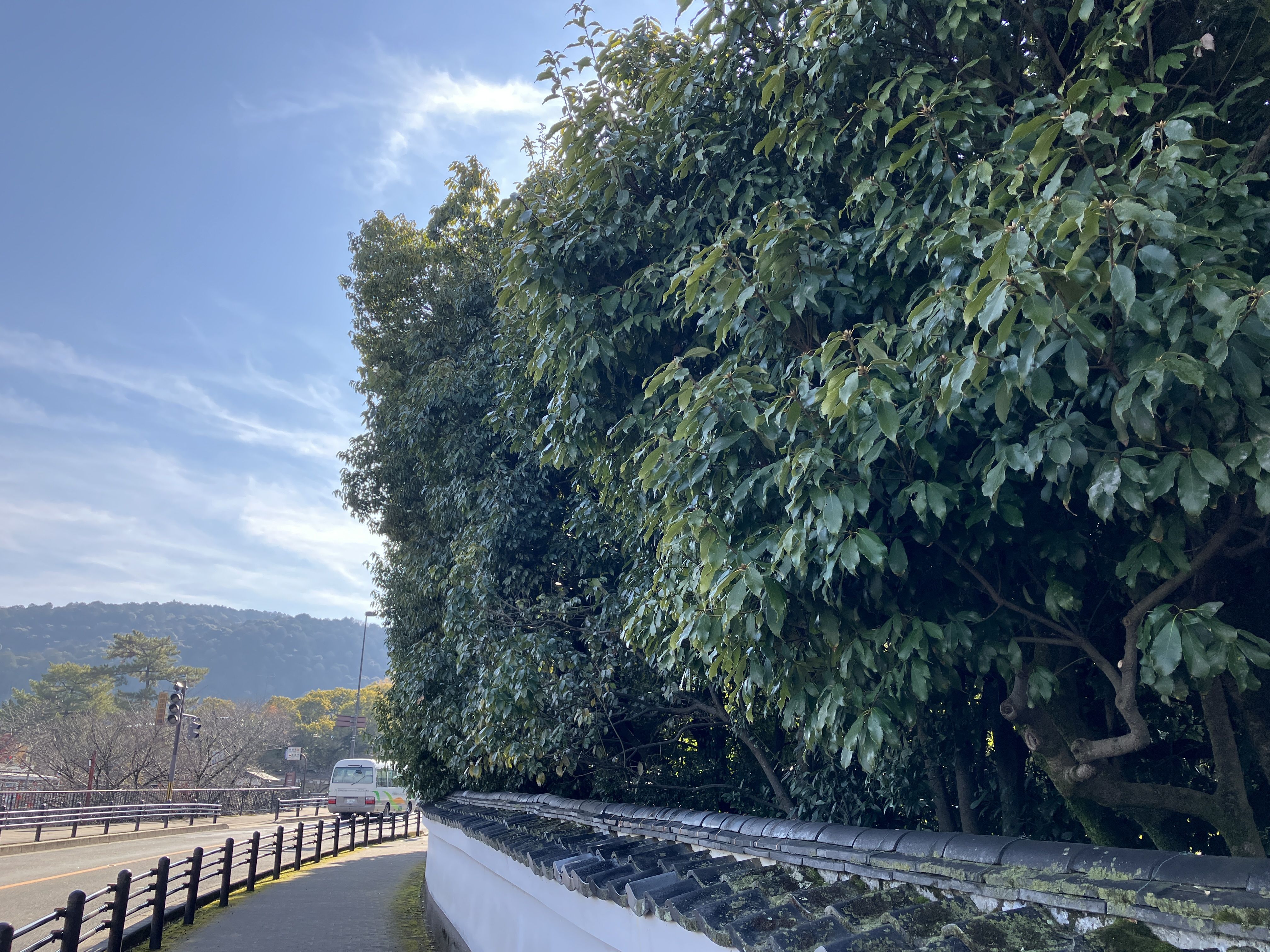 写真では枝が外壁をわずかに超えているようにみえますが、伸びすぎてしまうと周辺を歩かれる方の通行の妨げや安全面に影響を及ぼす可能性があります。そこで無鄰菴北側の境界樹木の剪定を3年ぶりに行うこととなりました。
