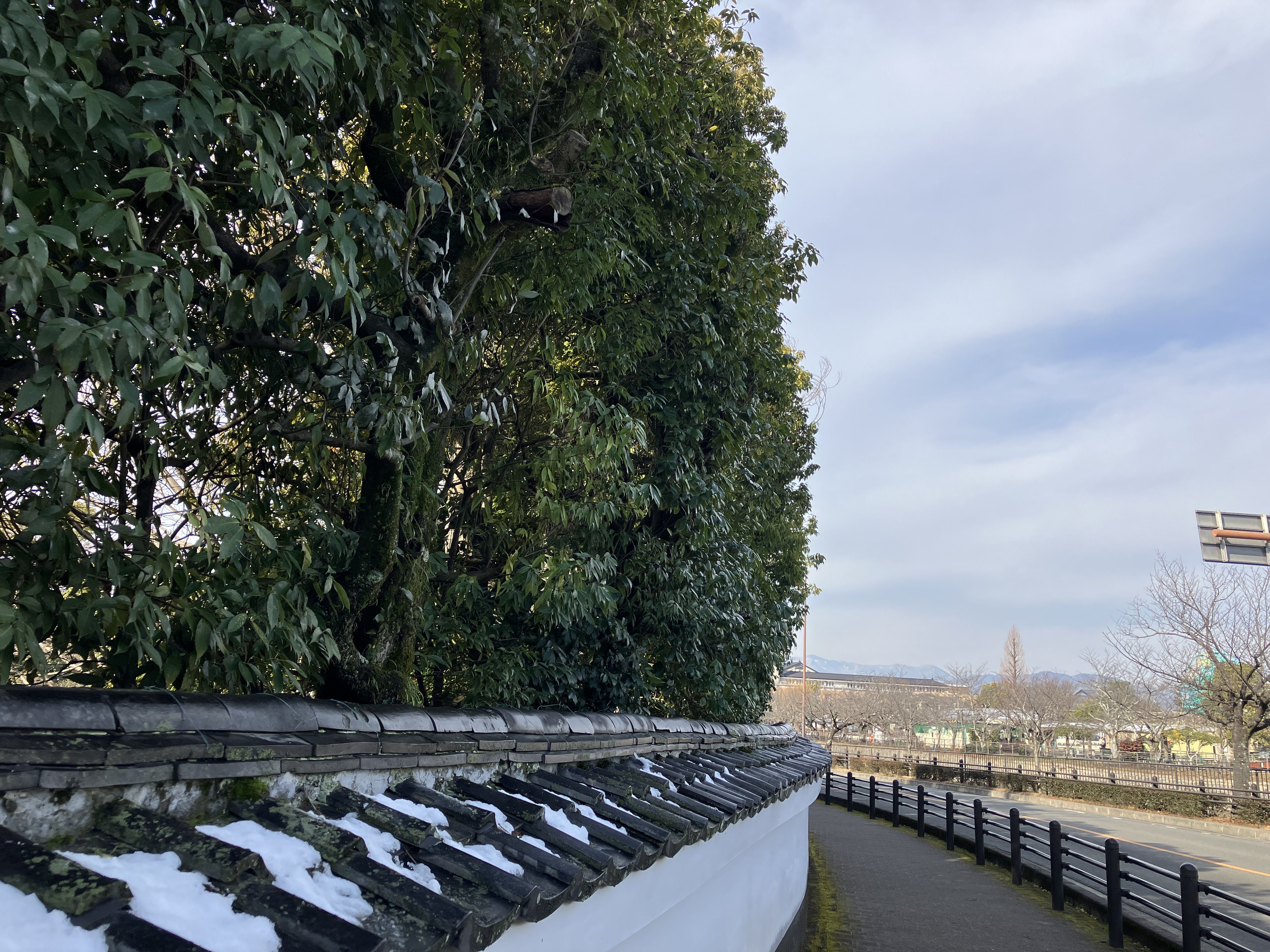 成長することを考えた場合、敷地境界となる塀の直線上で整えるのではなく、敷地のもっと内側、伸びた枝が調度塀に差し掛かる程度まで剪定することが望ましい姿です。しかしながら現在は冬期であり休眠期のため、強い剪定をすると位置と枝葉によっては新芽を吹かない可能性があります。そこで縮められる範囲まで仁王門通りに面した外側から剪定し、3月に再度調整することとしました。