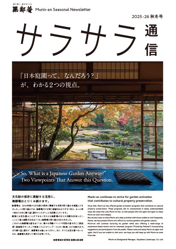 さらさらとは。無鄰菴の施主 山縣有朋が詠んだ歌「さらくと木がくれつたひゆく水の流れの末に魚のとぶみゆ」にちなんでいます。無鄰菴を途切れることなく流れるせせらぎのように、ここでの出会いが庭園を未来に育む流れとなりますように、名づけました。
